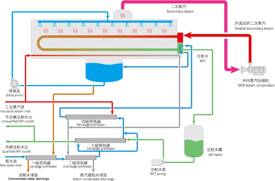 亞光最新研發生產的熱壓蒸餾水機使用了MVR節能技術,具有產水優質、節能效果顯著、安裝使用靈活等優點。亞光熱壓蒸餾水機產量可從1T/h至100T/h[1],既可為客戶提供大處理量中心式制水方案,基于其超低的產量范圍和撬裝模塊化設計,也可為客戶提供靈活的分布式注射用水生產解決方案。